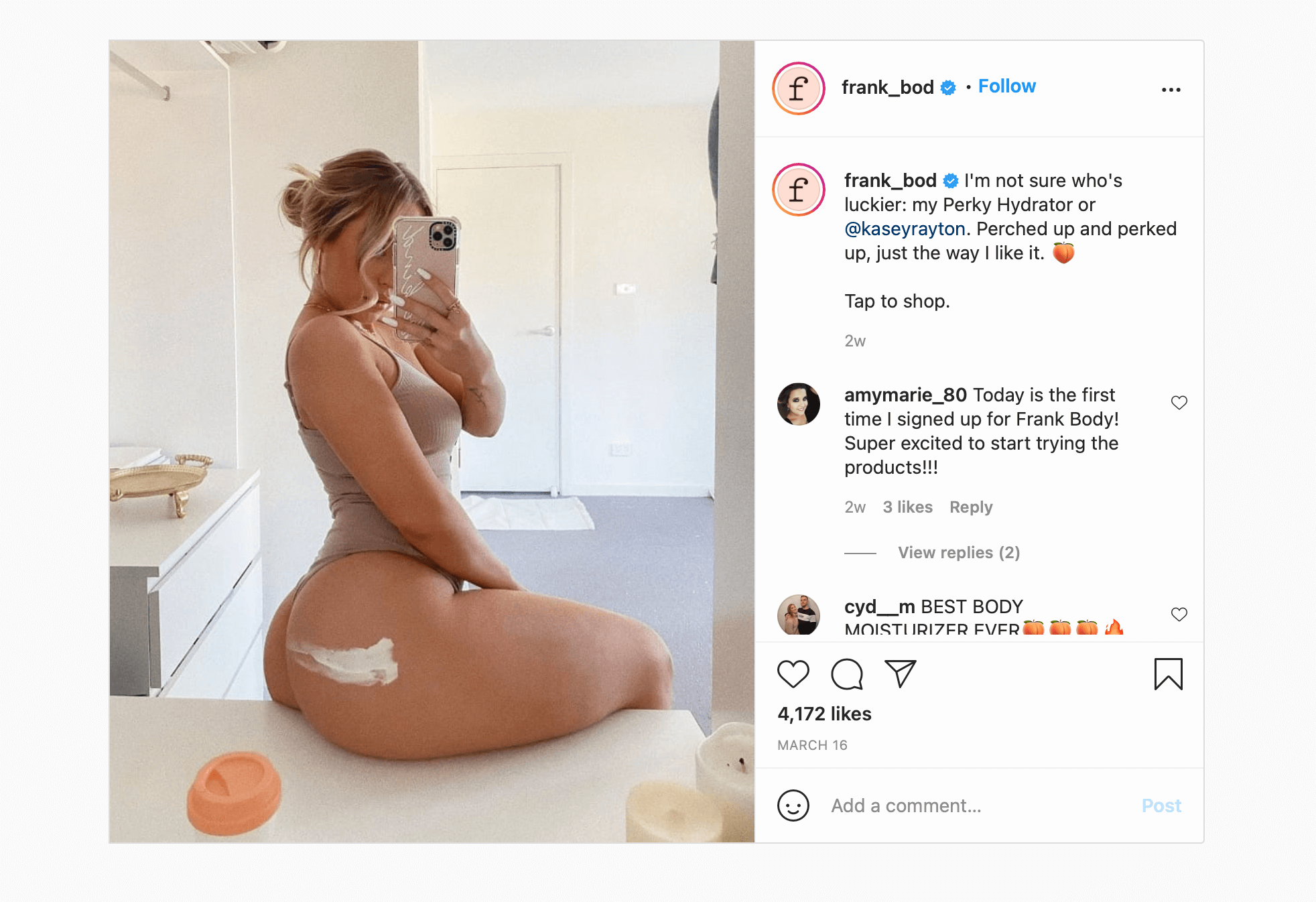 Instead of saying ‘contact us’, their website says ‘talk dirty to me’ with a customer support email of getnaked@frankbody.com, and even their warning labels for allergies says ‘Psst, babe, I contain nuts’. When they wanted to expand their target audience to men, they launched a campaign #iscrubbothways. When working with influencers they use innuendo like ‘Tousled hair. Flushed cheeks. Now that’s a good scrub.’