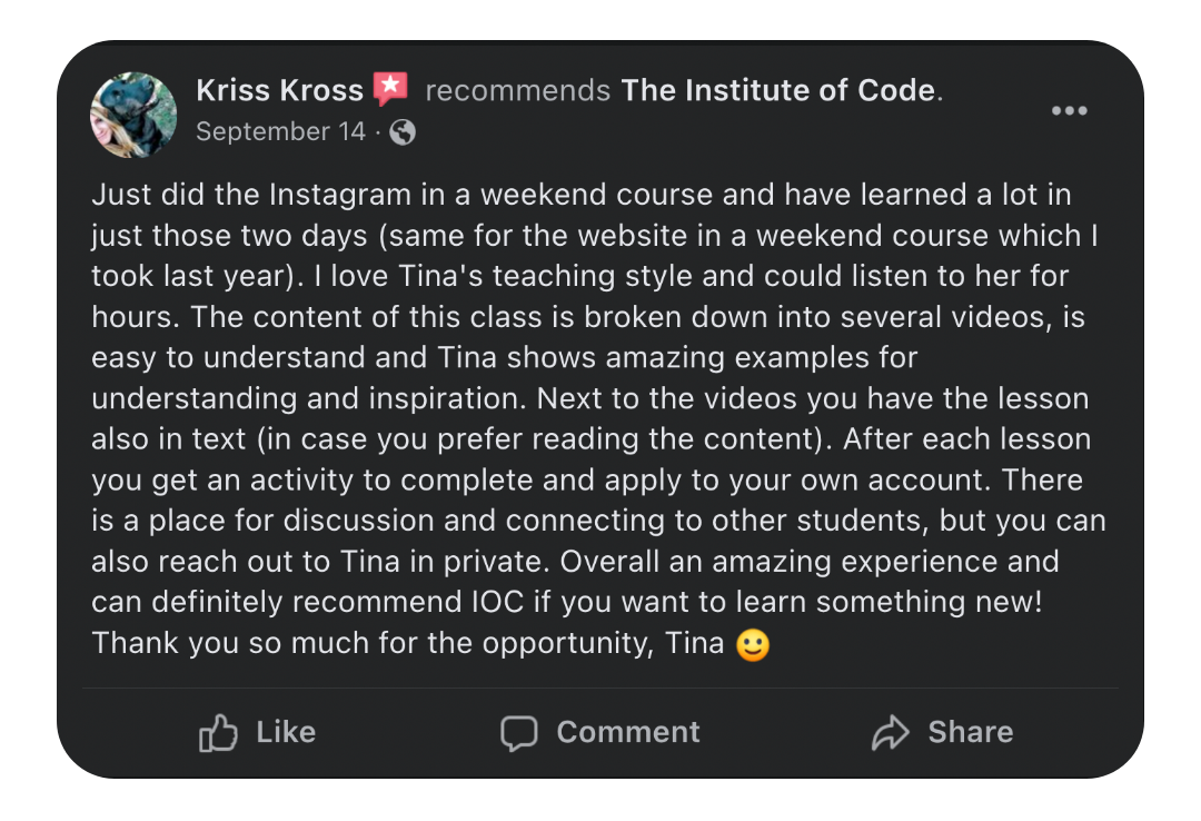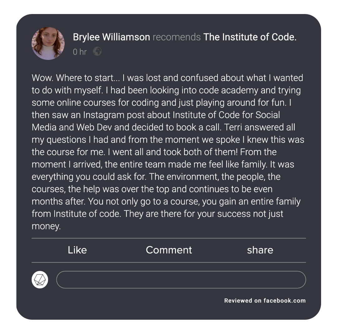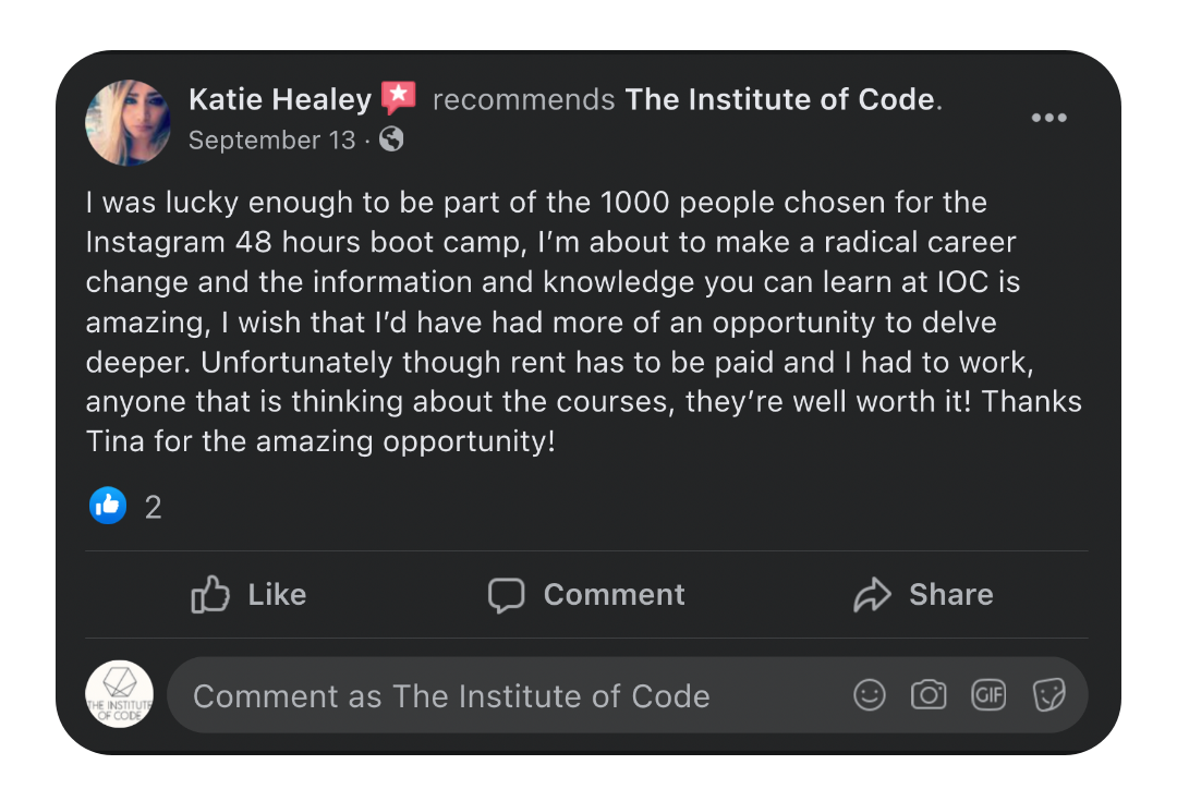 One of the most important parts of our digital bootcamp model is the hands-on support provided by mentors. We have numerous challenges for support and every single lesson includes a practical activity that you can share with the mentors for one-on-one feedback. We also have weekly Q&As where you can ask questions specific to your needs or to go more in-depth in the content offered. It's the most hands-on, supportive program of it's kind and one of the things our alumni rave about most in their reviews.