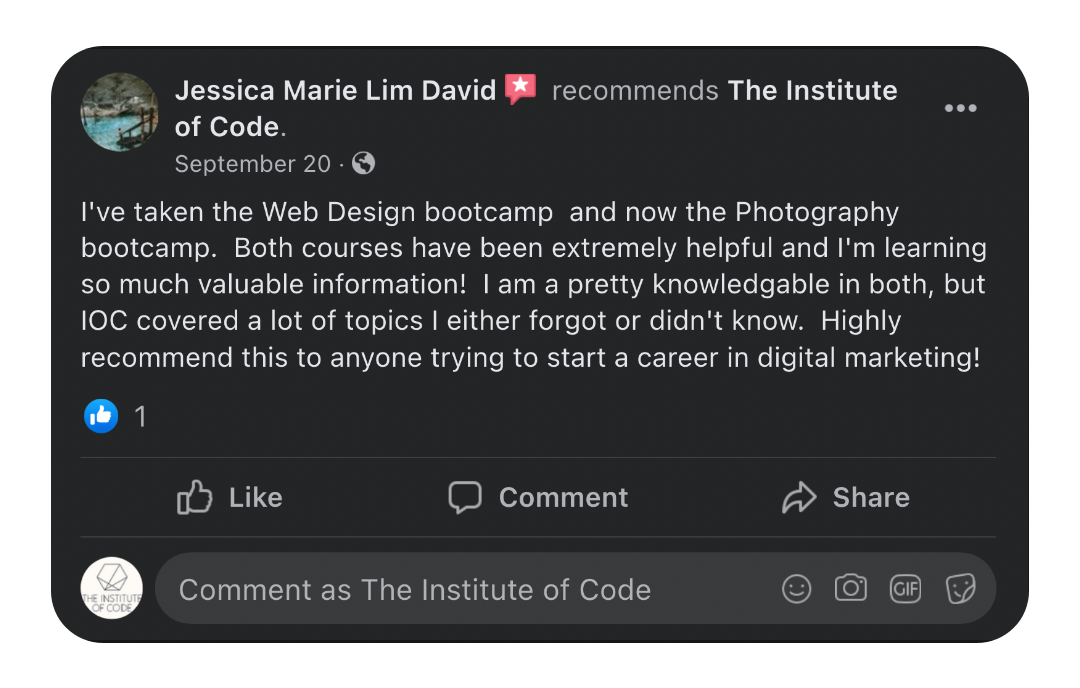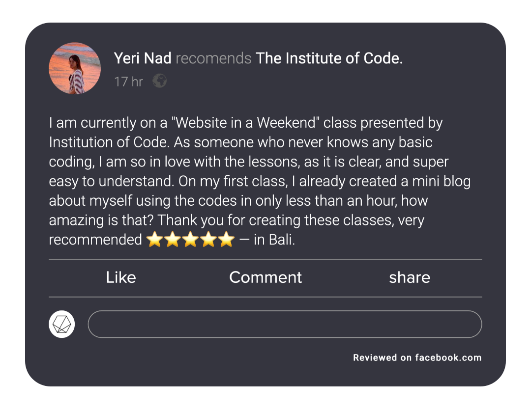 Bali is our island home, and so we want to give back in the best way we can - through the gift of education, empowering our local Balinese community to learn in-demand digital skills. For every bootcamp purchased between now and the end of this year, we'll give a full-ride scholarship to one of our beginner friendly foundation courses (worth $350 each) to a Balinese person. Know someone who could benefit from this scholarship? Share it with them here.