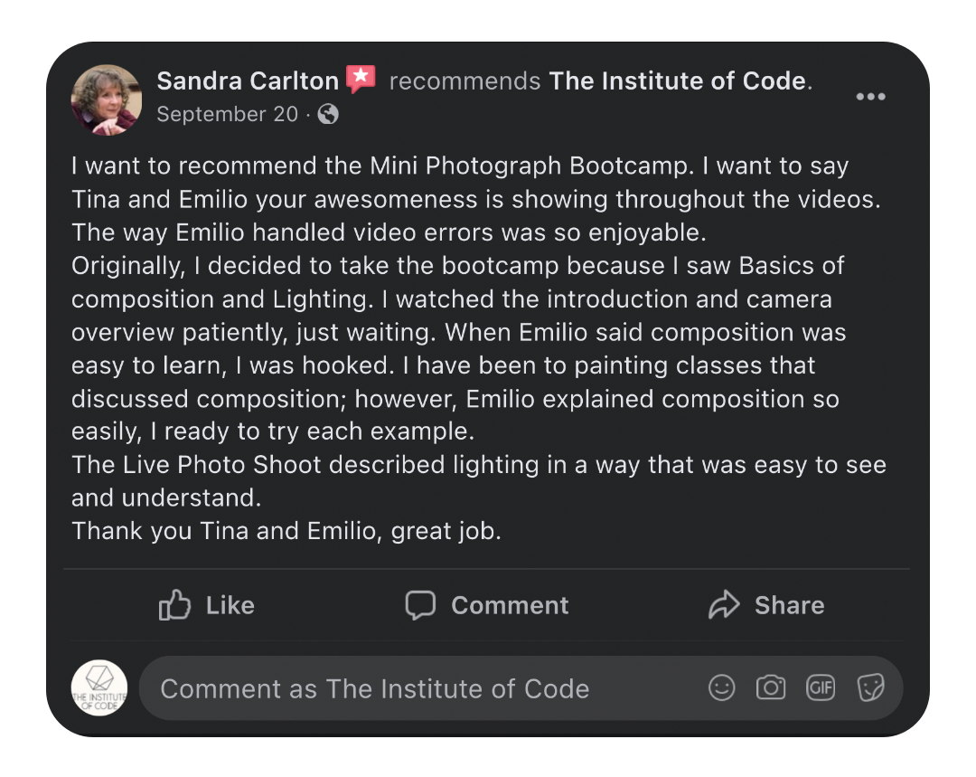 Our digital bootcamps are a zero-to-hero program... starting from little to no previous experience we'll teach you everything you need to know to start a career in Photography, Marketing or Web Development. From foundational to advanced skills, as well as step-by-step how to build a portfolio, market yourself, attract clients and build a thriving business we cover it all. This is a hands-on program with access to mentor support on-demand from the moment you enroll until you finish the program (and launch your new business!) as well as 12 months of access to our mastermind program.