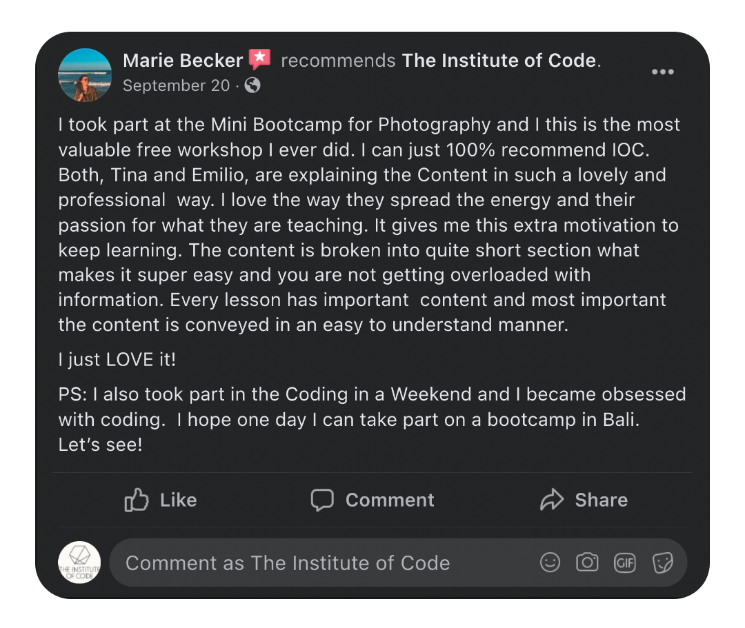 Everything you spend on a mini-course can be used towards the digital bootcamp, and everything you invest in a digital bootcamp can be used as a credit towards the Bali bootcamp of the same program (Web Development, Photography or Marketing) within 12 months.
