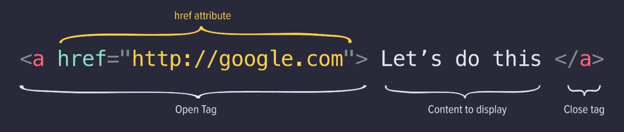 Anchor links are the element that allows us to navigate either between different pages on our website, to other websites, or even to different sections on the same page. Unlike the other text elements, our anchor links need an extra attribute of href. Think of it as the destination of the link (where you go when you click on the link). Importantly, this needs to be the full link (including the http:// or https://) to work consistently.