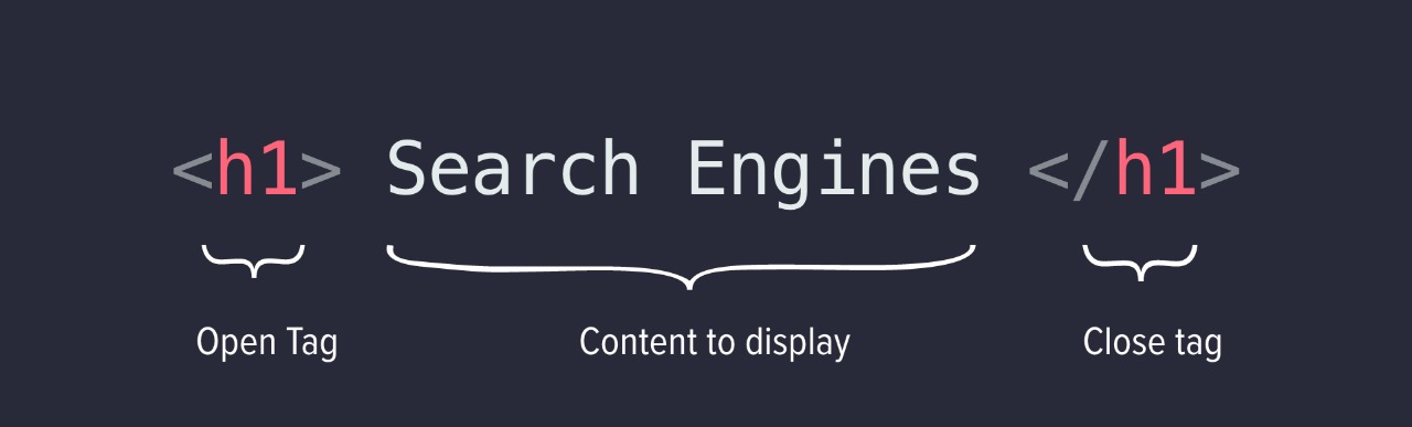 To create a level one heading, the element name is h1. So we put that inside the open tag and the close tag. What we’ll actually see on the browser screen is just the word “search engines”, the content in-between the tags.