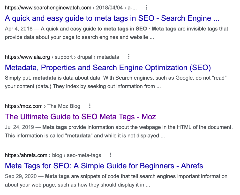 Website metadata is largely about meta tags. Meta tags are a type of HTML tag that provides search engines with information about a website page. Whenever you find a website through Google search and then click through to it, you likely did so because of the metadata.