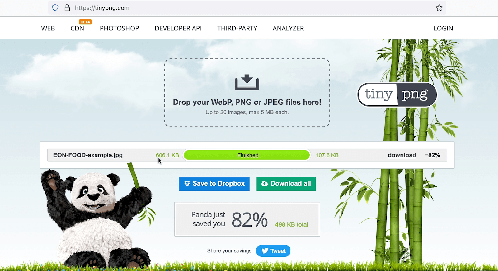 Once I use the Mac Finder to shrink it down to an appropriate size, I’ll upload the image to tinypng.com to optimize them. The cool thing about TinyPNG is that it can often make a big impact on the file size without any visual difference.