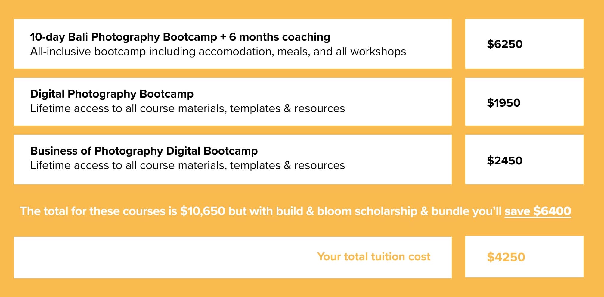 We've partnered with Build & Bloom to offer over $10,000 worth of scholarships to our Photography bootcamps and with the option to study either online or in-person in Bali we know we've got something for everyone.